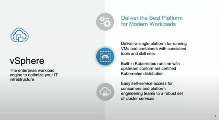 VMware provides self-service access for developers as well as IT service users, as well as built-in Kubernetes with support for VMs and containers, the modern platform.