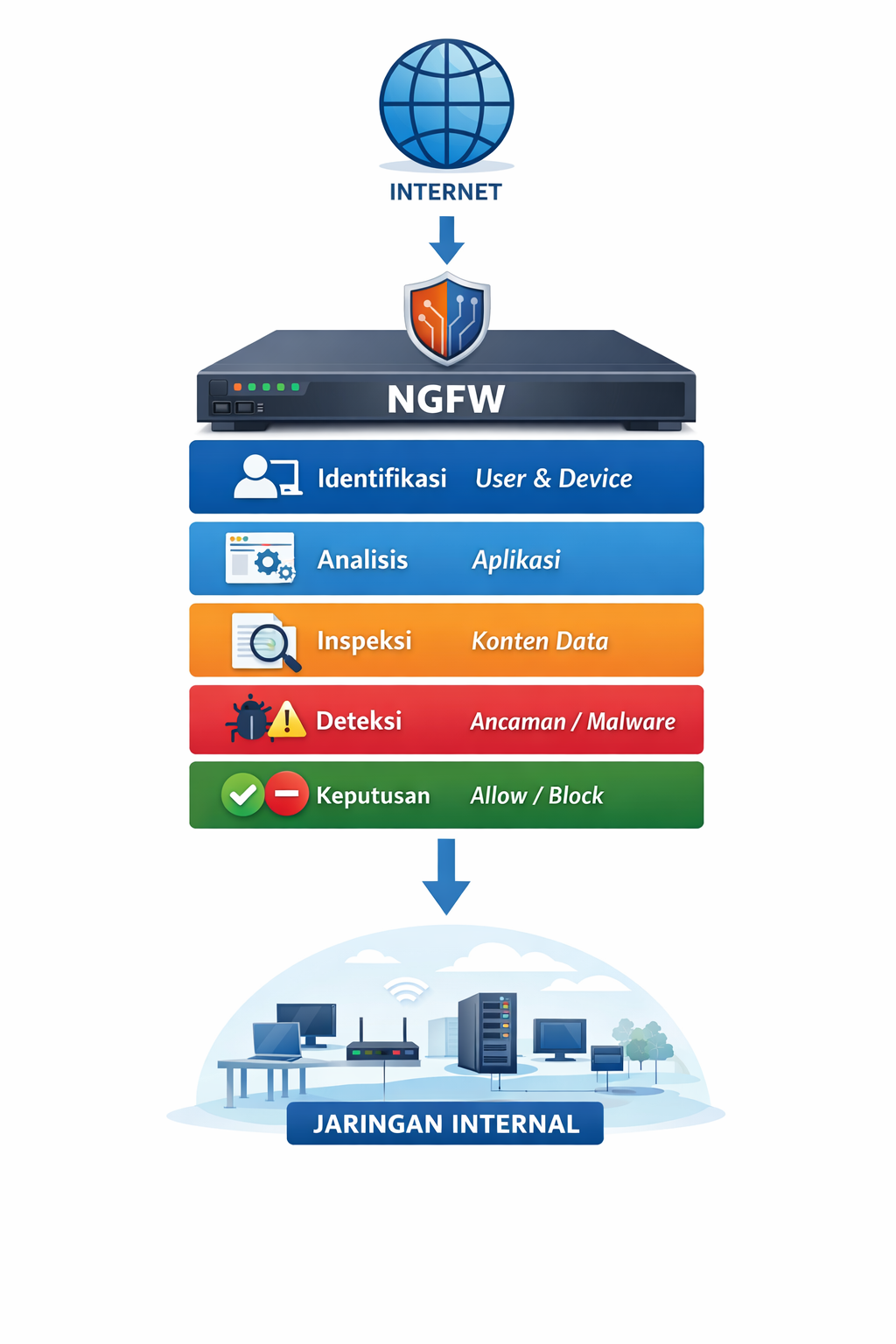 The diagram illustrates the flow of internet traffic entering the NGFW system, then passing through several stages of analysis such as user identification, application inspection, content filtering, and threat detection before being either forwarded or blocked from accessing the internal network.