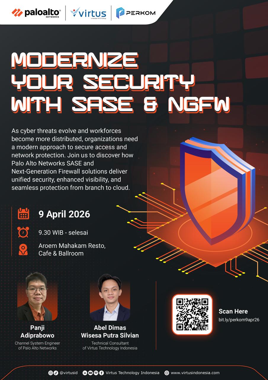 The event, titled “Modernize Your Security with SASE & NGFW,” was co-hosted by Perkom, Virtus Technology Indonesia, and Palo Alto Networks—three names that each carry significant weight within Indonesia’s enterprise technology ecosystem.